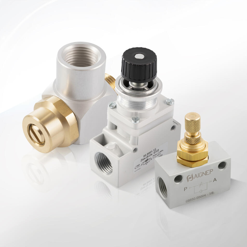 Zawory dławiąco-zwrotne kątowe mosiężne w wersji z pokrętłem regulacyjnym – oferują bardziej precyzyjną regulację natężenia przepływu niż warianty standardowe, umożliwiając dokładne dostrojenie parametrów pracy siłowników. Ryflowane pokrętło zapewnia pewny chwyt i łatwość ustawień nawet w warunkach przemysłowych.