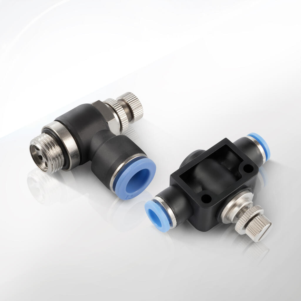 Zawory dławiąco-zwrotne wtykowe z tworzywa sztucznego – lekkie, kompaktowe elementy o korpusach wykonanych z wytrzymałych polimerów technicznych (POM, PA6), wyposażone w szybkozłączki kalibrowane pod standardowe przewody PU, PE, PA (np. fi 4, fi 6, fi 8, fi 10 mm). Ich budowa pozwala na łatwy montaż bez użycia narzędzi i szybkie wpięcie węży pneumatycznych.