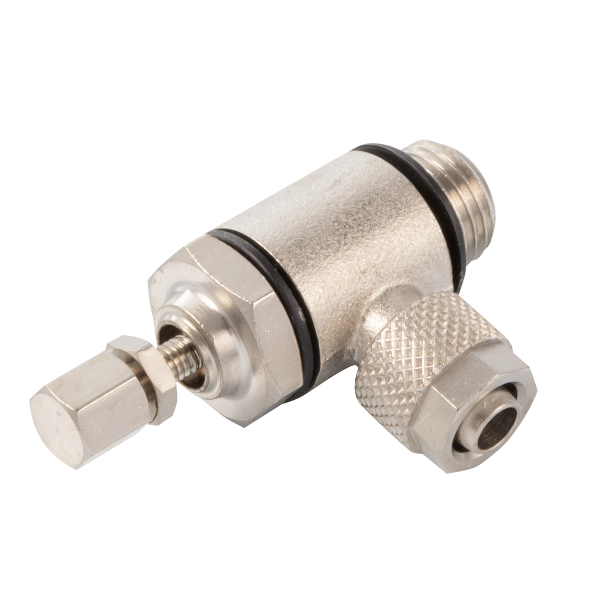 Zawór dławiąco-zwrotny skręcany M5 na wąż fi 6×4 mm z regulacją pokrętłem, mosiądz niklowany