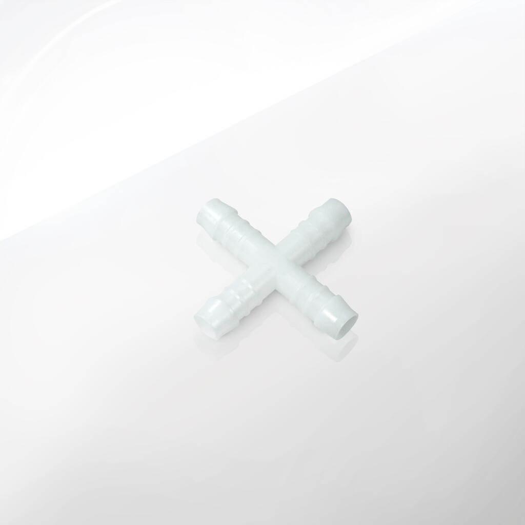 Czwórniki pozwalają na równoczesne rozdzielenie lub scalanie czterech odcinków przewodów. Najczęściej stosuje się je w systemach, w których występuje potrzeba rozgałęzienia przepływu medium na kilka kierunków. Ich budowa umożliwia łatwe wpinanie węży PVC oraz pewne trzymanie dzięki właściwościom zaciskowym tworzywa POM.Trójniki redukcyjne typu T