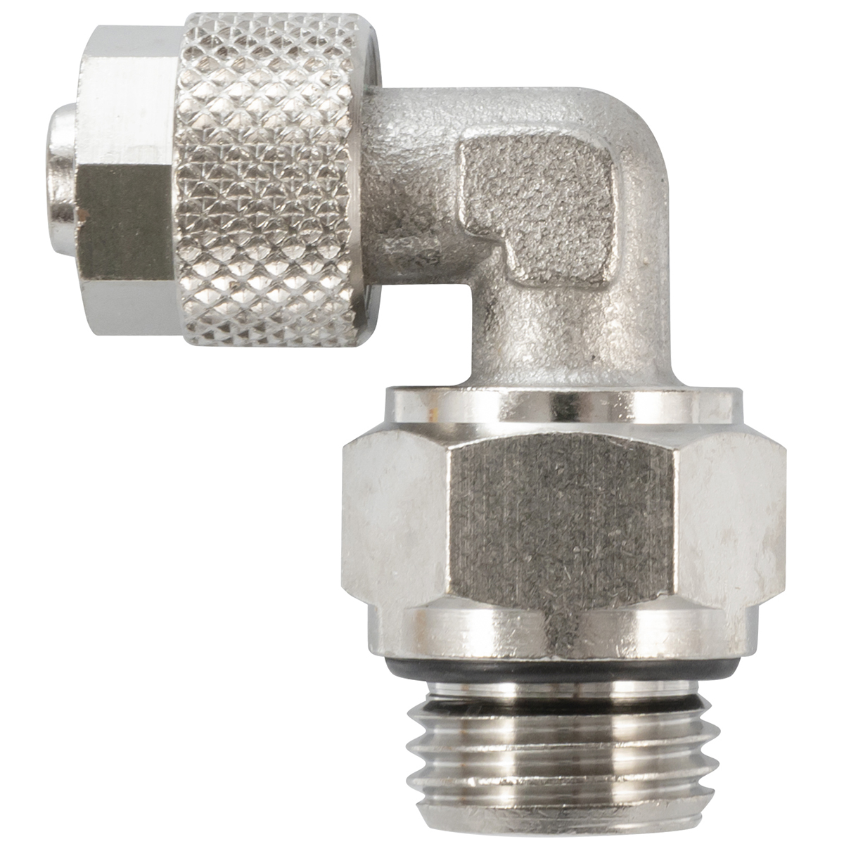 Złączka skręcana kątowa obrotowa, gwint zewnętrzny G1/4 do przewodu fi 6/4 mm, mosiądz niklowany.
