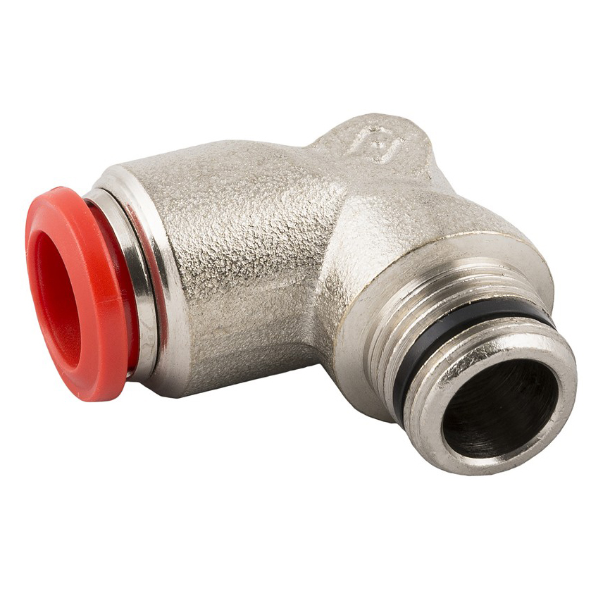 Złączka wtykowa kątowa gwint zewnętrzny R1/8 do przewodu fi 8 mm, mosiądz niklowany