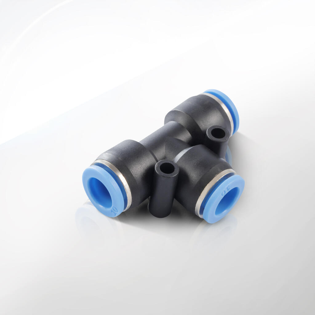 Trójniki redukcyjne typu T (seria 84.0050.21): Rozgałęzienie z redukcją średnicy, np. z 10 mm na 6 mm, stosowane w systemach zróżnicowanego przepływu, takich jak linie montażowe.