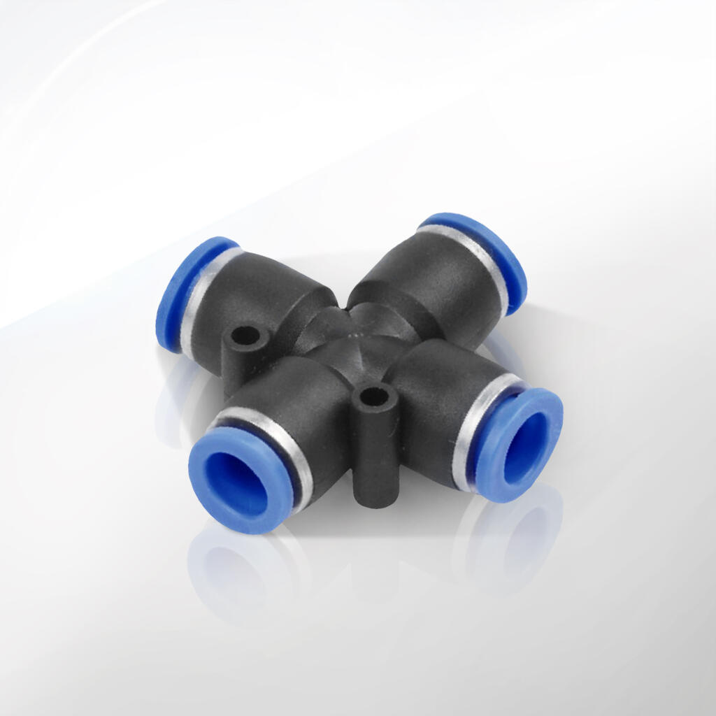 Opis: Umożliwiają podłączenie czterech przewodów jednocześnie, tworząc czterokierunkowe rozgałęzienie. Ich symetryczna konstrukcja zapewnia równomierny przepływ medium we wszystkich kierunkach.