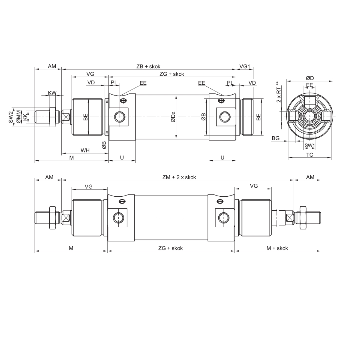 11.070E.0060AX - Siłownik okrągły D32x60 dwustronnego działania z amortyzacją pneumatyczną