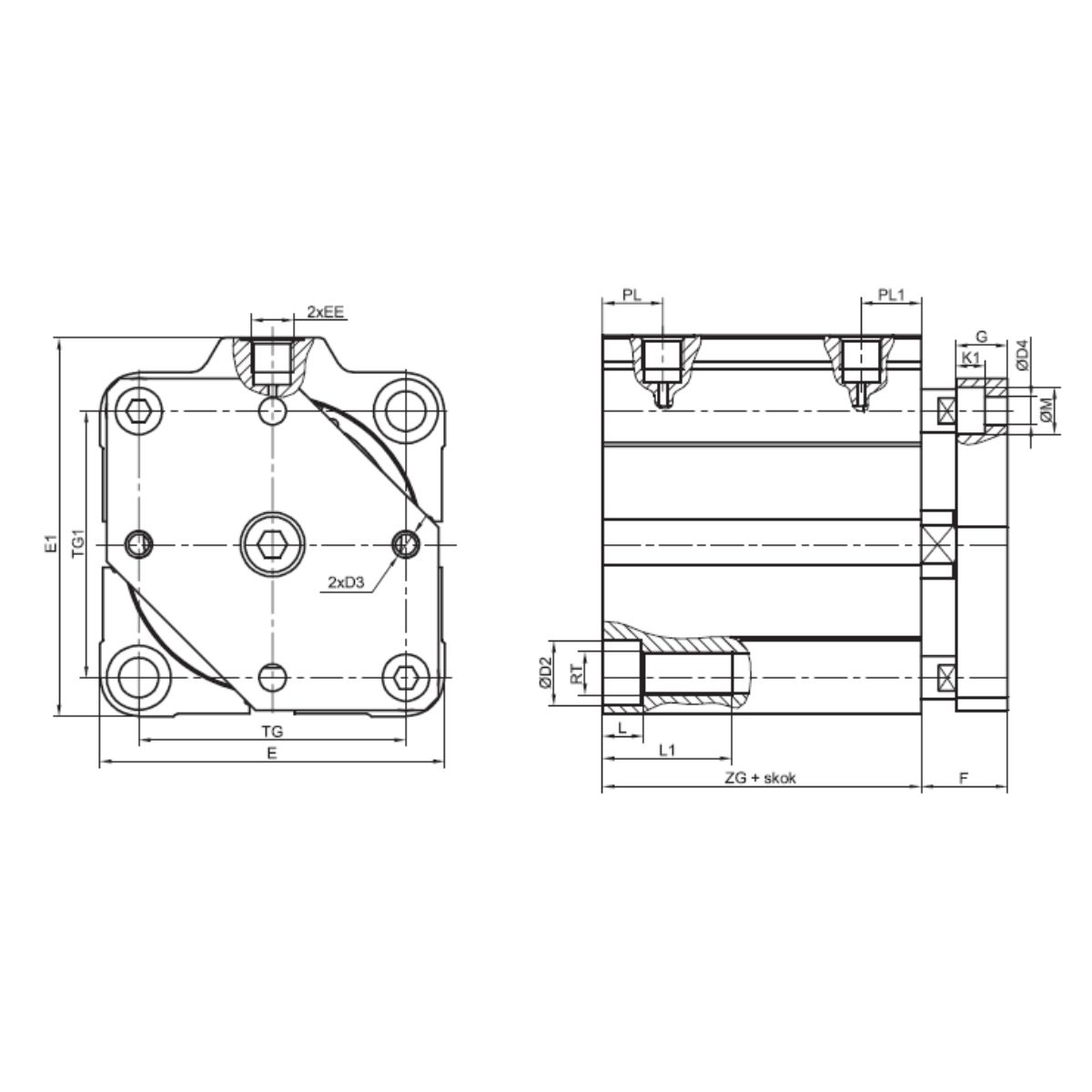 - Seria SDK 031,131 ZT jednostronnego działania z jednostronnym tłoczyskiem pchające zabezpieczone przed obrotem (antyobrotowe)