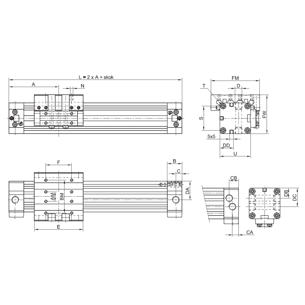 11.512E.0320ZFK - Siłownik beztłoczyskowy ZFK D32x320 z prowadzeniem bocznym skrócony przyłącza z jednej strony