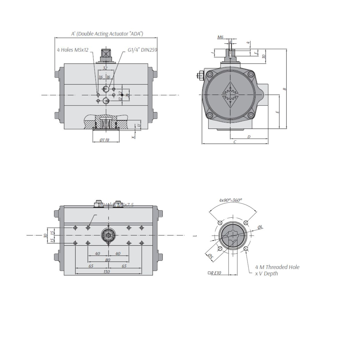 14.ADA2100.F16.R46 - Siłownik obrotowy dwustronnego działania ADA2100, ISO 5211 F16, kwadrat 46 mm