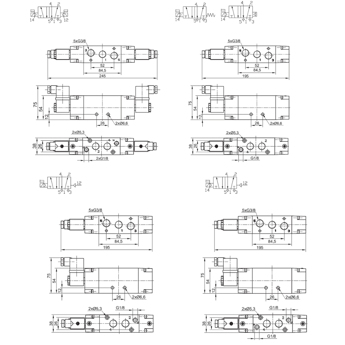 22.0808.5238B - Elektrozawór ZE 5/2 G3/8 monostabilny z sygnałem obcym powrót ciśnieniem obcym cewka 24V DC 6,5W