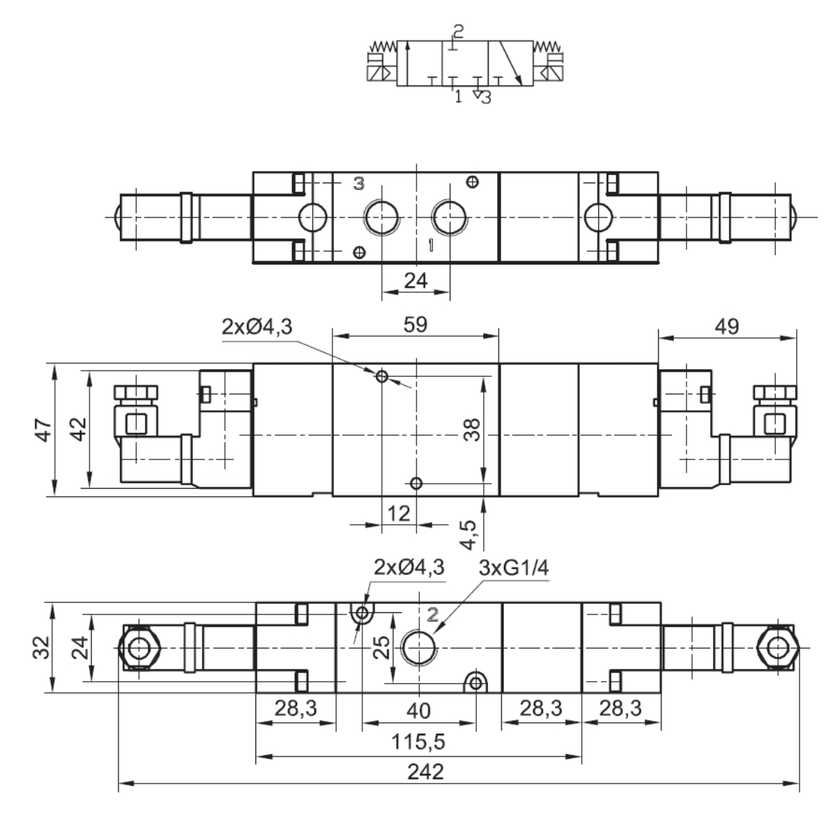 22.1709.5314E - Elektrozawór pneumatyczny rozdzielający ZEM 5/3 G1/4 CC centralnie zamknięty cewki 24V AC 3VA