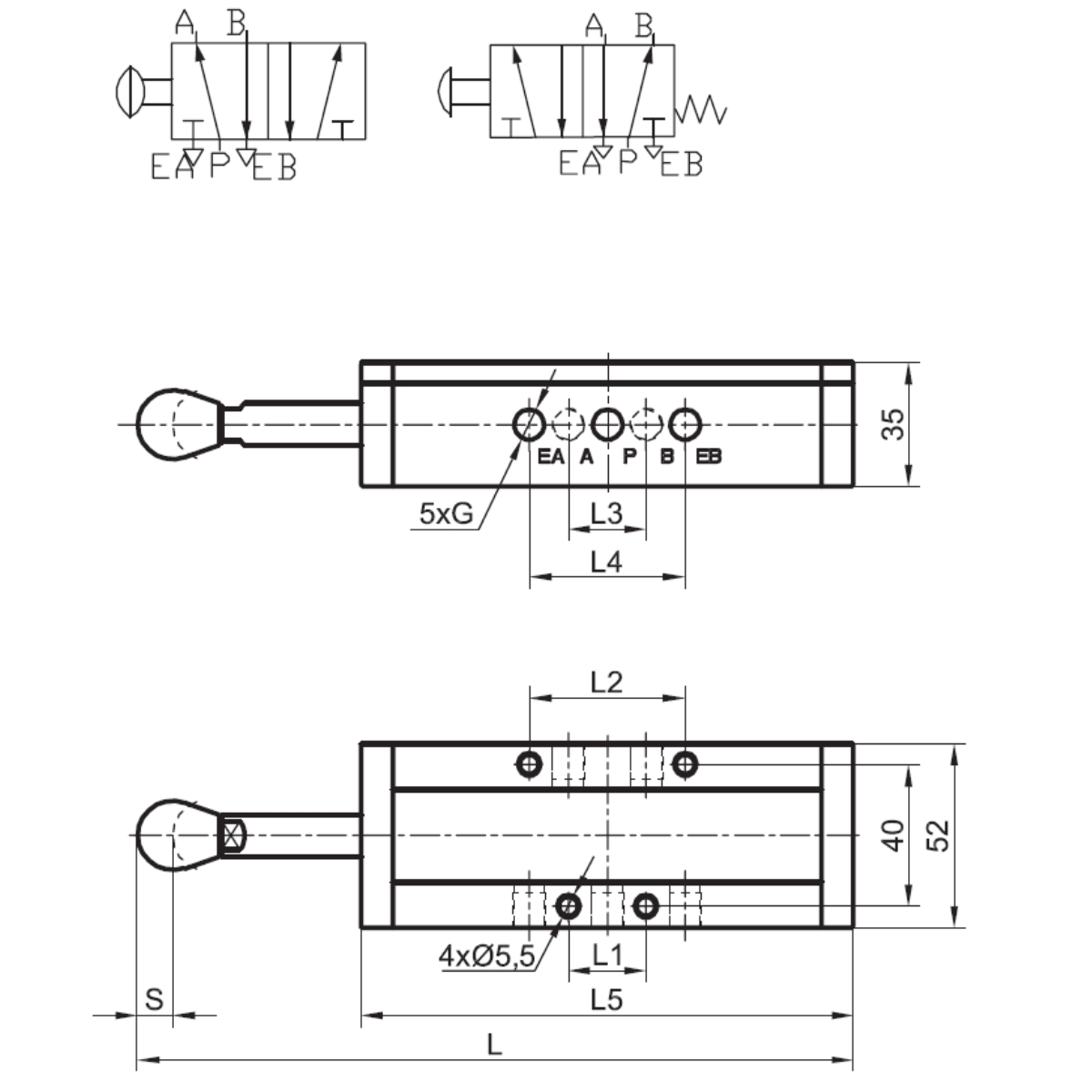 24.0103.5218 - Zawór rozdzielający ręczny DTM 5/2 G1/8 z cięgłem powrót sprężyną (zasilany przewodowo)