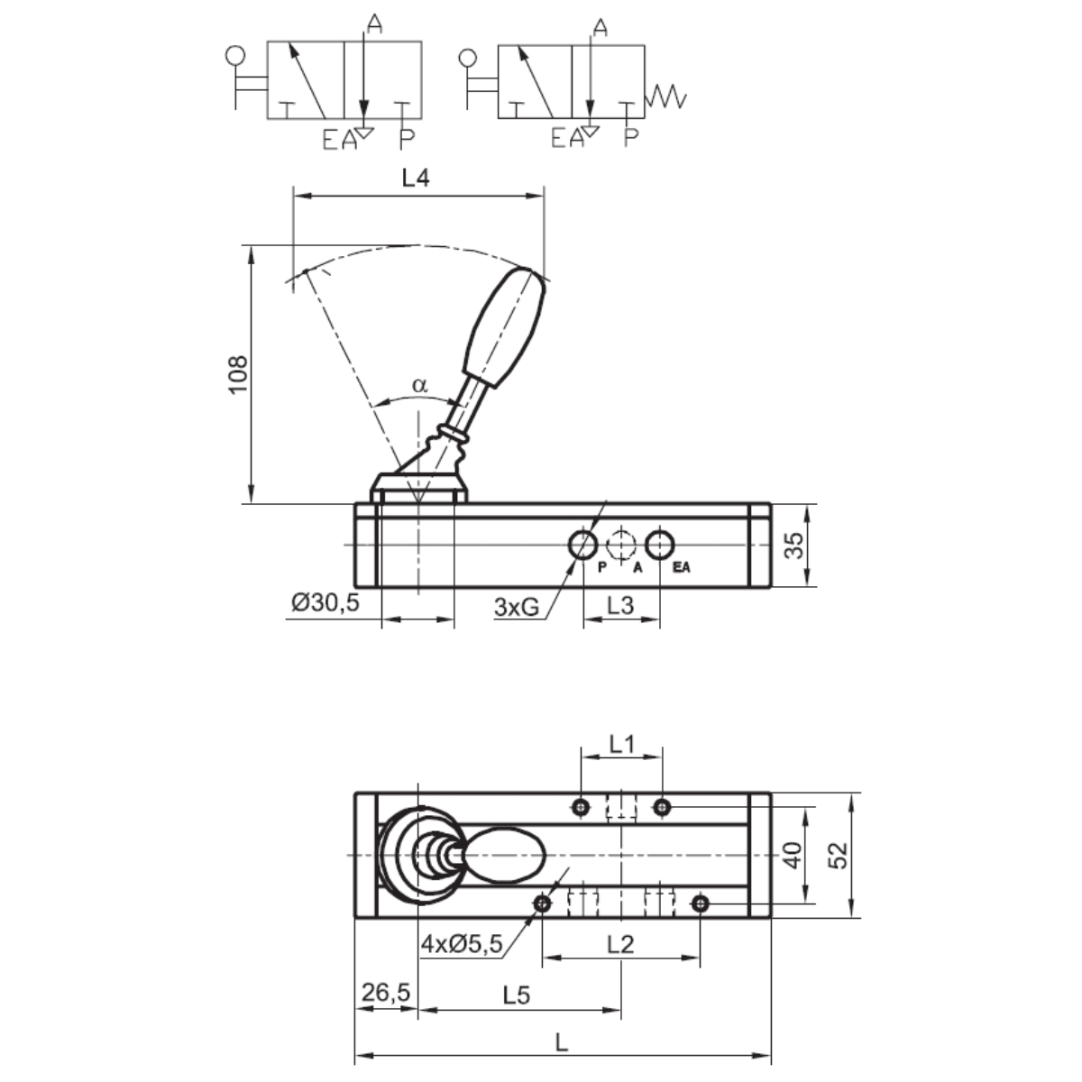24.0109.3214 - Zawór rozdzielający ręczny DTM 3/2 G1/4 NC/NO z dźwignią powrót sprężyną (zasilany przewodowo)