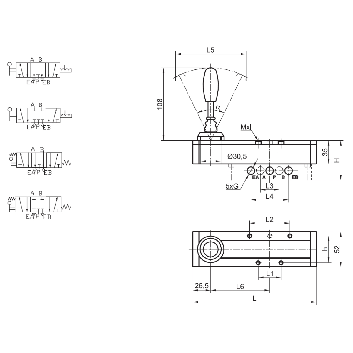 24.0118.531814 - Zawór ręczny DTM 5/3 G1/8-1/4CC centralnie zamknięty z dźwignią,ze sprężynami (zasilany płytowo)