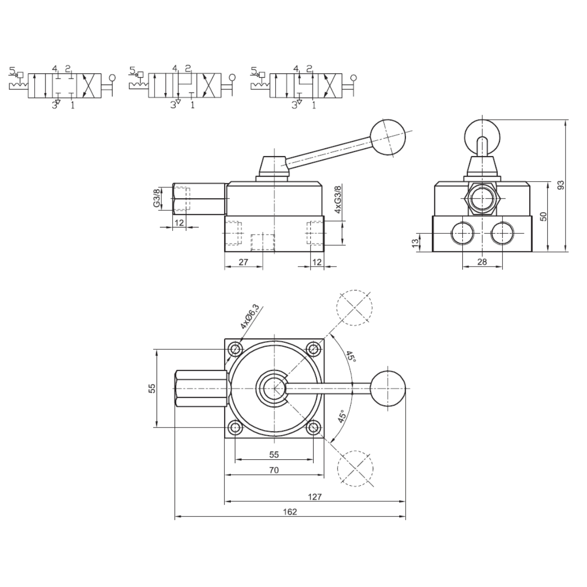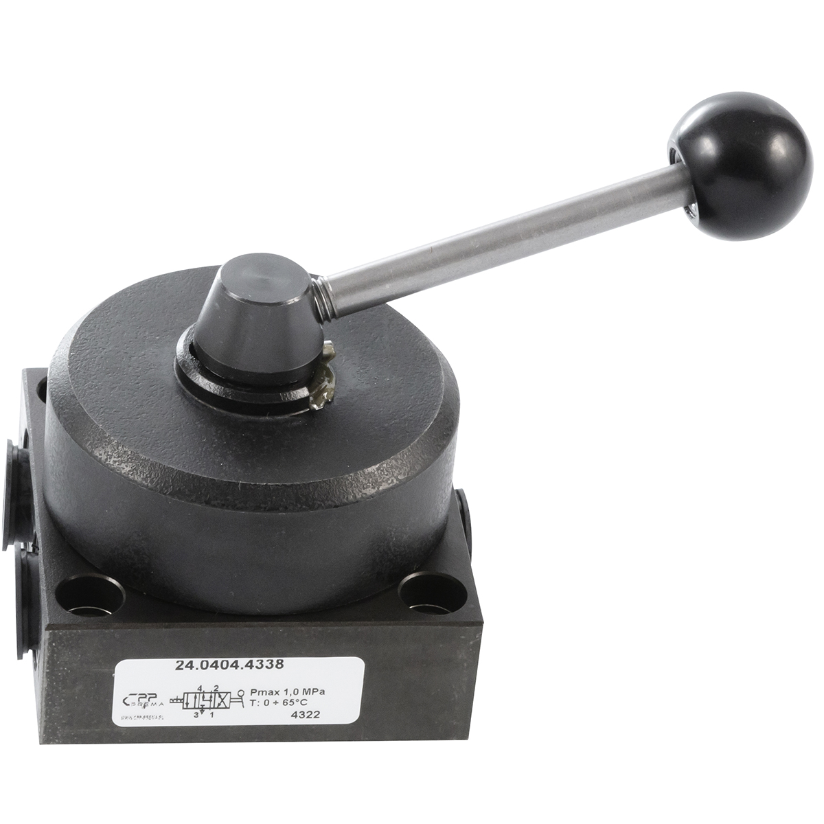 24.0402.4338 - Zawór rozdzielający ręczny płytkowy PM 4/3 G3/8 z blokadą, CO centralnie otwarty