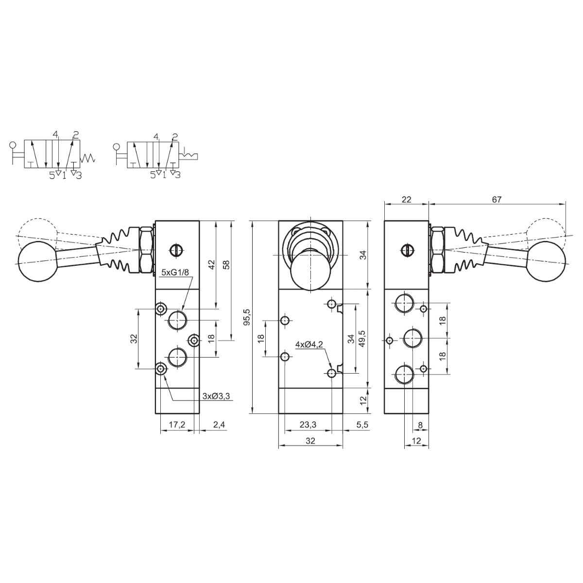 24.0509.5218 - Zawór z dźwignią TM 5/2 G1/8 monostabilny powrót sprężyną