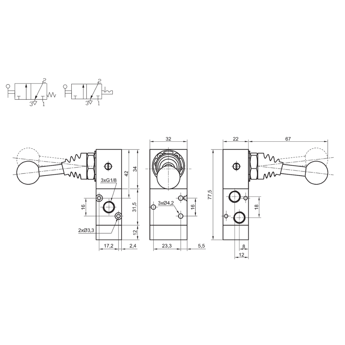 24.0510.3218 - Zawór z dźwignią TM 3/2 G1/8 NC normalnie zamknięty bistabilny bez sprężyn