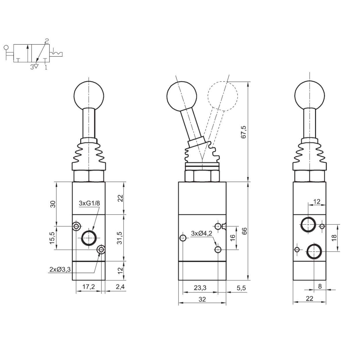24.0511.3218 - Zawór z dźwignią TM 3/2 G1/8 NC normalnie zamknięty pionowy bez sprężyn z zatrzaskiem