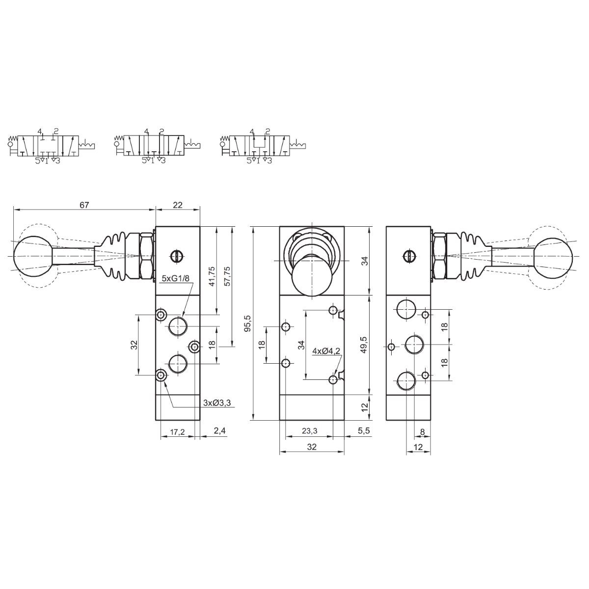 24.0516.5318 - Zawór z dźwignią TM 5/3 G1/8 CP centralnie zasilony, bez sprężyn z zatrzaskiem