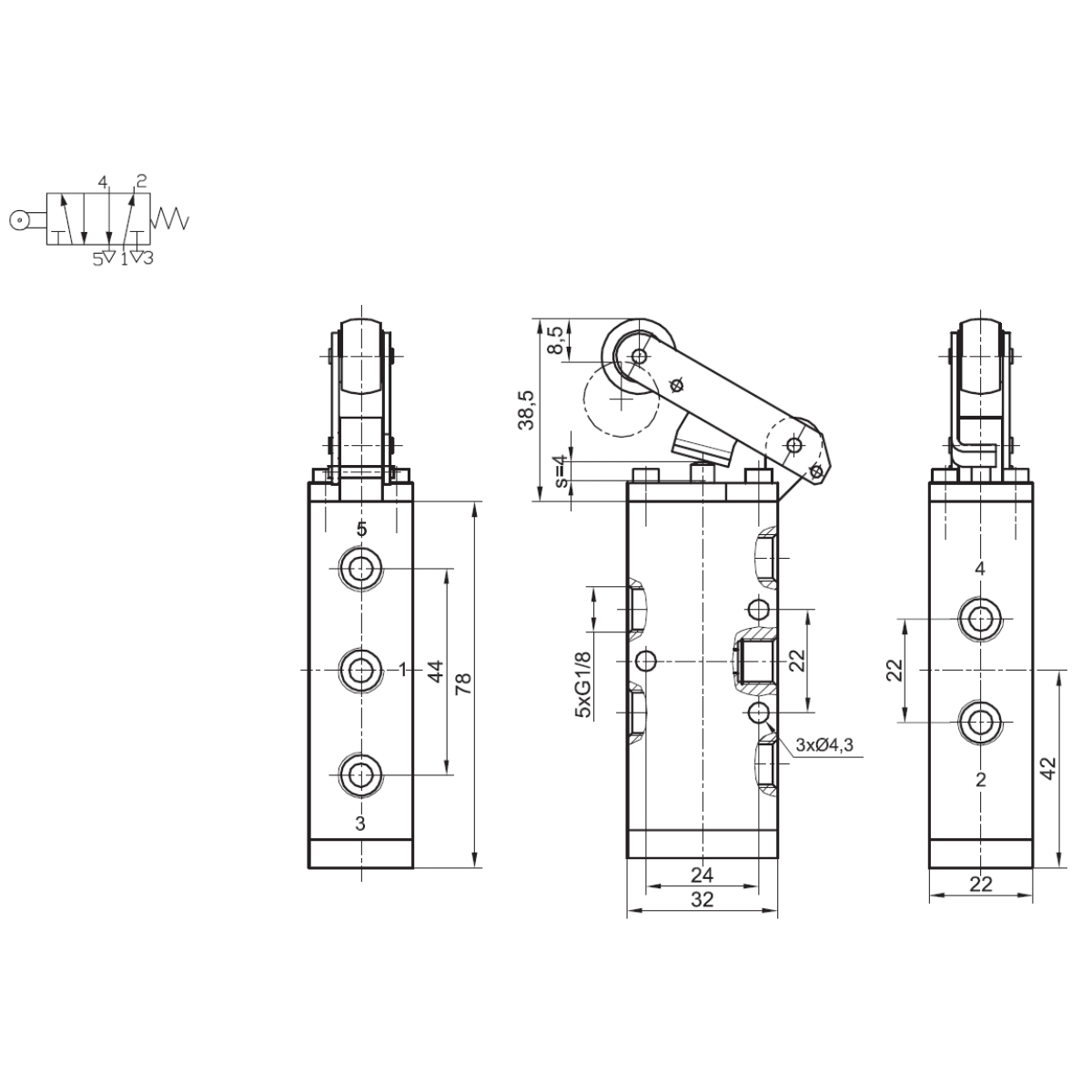 24.2616.5218 - Zawór pneumatyczny rozdzielający ręczny PZR 5/2 G1/8 sterowany dwukierunkowo dźwignią z rolką