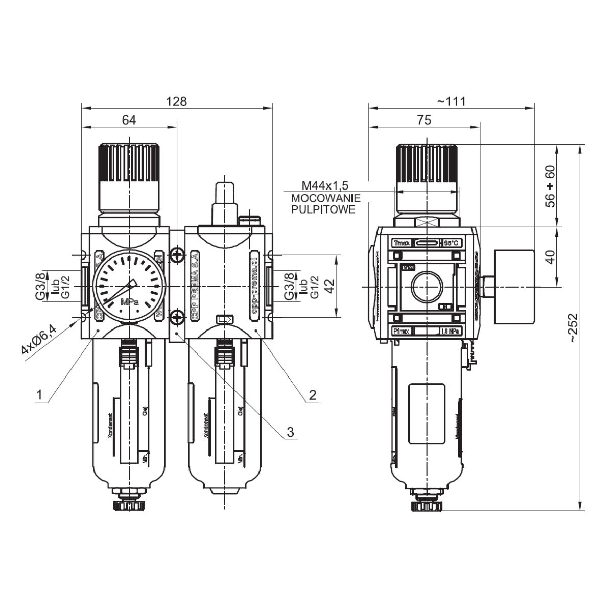 50.2502.3807.40 - Blok przygotowania sprężonego powietrza PSP2 NOVA G3/8 Pmax=12 bar, regulacja 0,5-7 bar, 40 um