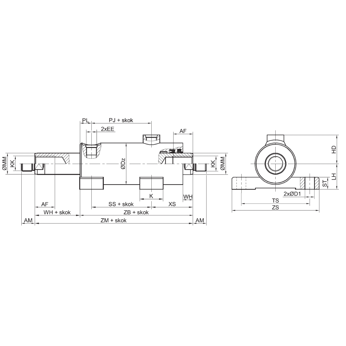 - Siłowniki hydrauliczne dwustronnego działania z łapami poprzecznymi typu 2S2 (na łapach z dwustronnym tłoczyskiem) UCD6