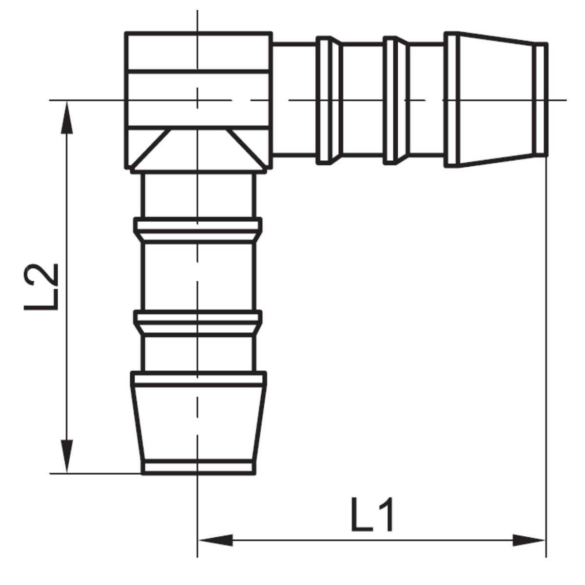 80.0034.03.04 - Złączka kątowa karbowana, choinka do węża fi 4 mm, tworzywo sztuczne